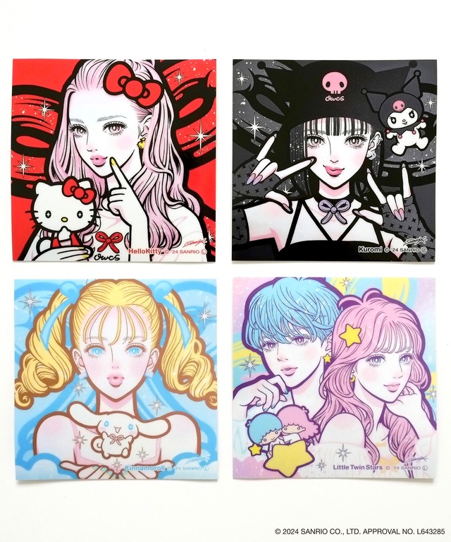isayamax × サンリオキャラクターズ ステッカー4種セット サイズ / W70×70mm×4種 仕様 / UV白塩ビフィルム、UVインクジェット印刷、光沢ラミネート、強粘着のり、OPP袋 70年代から現在までのドメスティックなカワイイ文化を一貫して表現するIsayamax。その始祖とも言えるサンリオの“One World, Connecting Smiles.”というビジョンに共感し描くコラボレーションシリーズ第一弾の4キャラクター(ハローキティ、シナモロール、クロミ、リトルツインスターズ)のステッカー4枚セットです。 屋外でも使用可能な耐光性の高いフィルムと印刷で仕上げました。 表紙はランダムになります。 ©2024 SANRIO CO.,LTD.APPROVAL NO.L643285