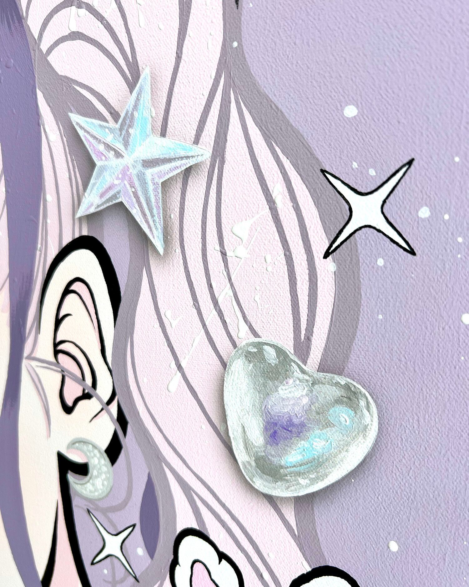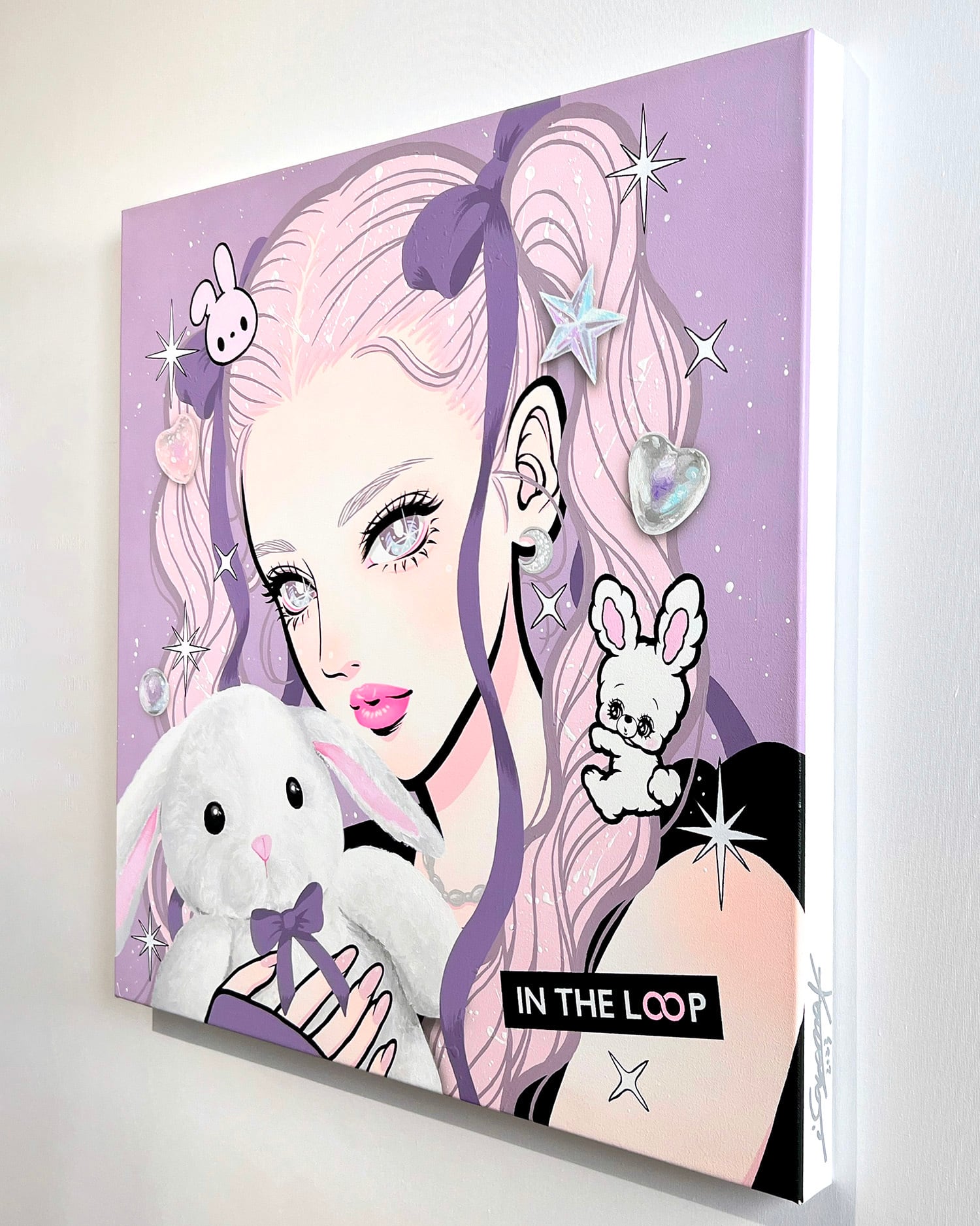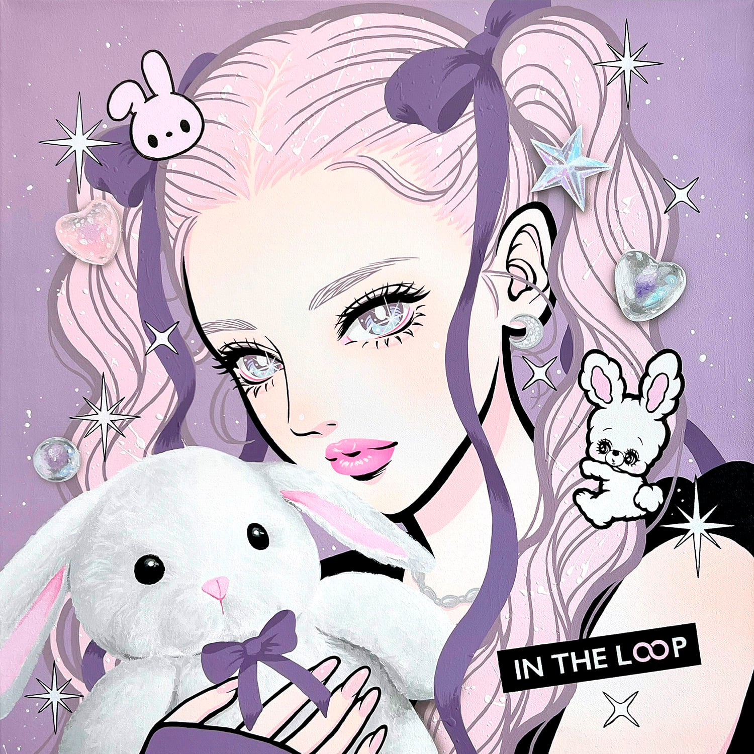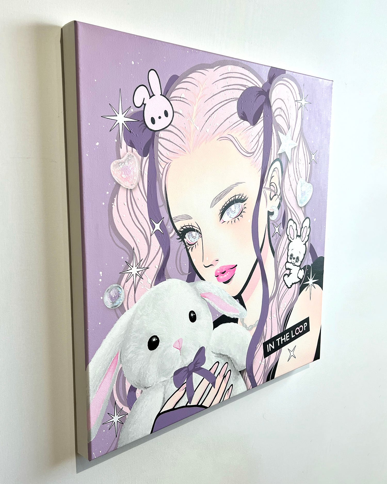 This piece is the 11th work in the “Decorume” series, which combines two key elements of Japanese kawaii culture: “deco” (decoration) and “deformation” (stylization). The composition brings together different dimensions of kawaii—from a realistic plush toy to a graceful female figure and a stylized rabbit character—harmoniously within a single canvas.